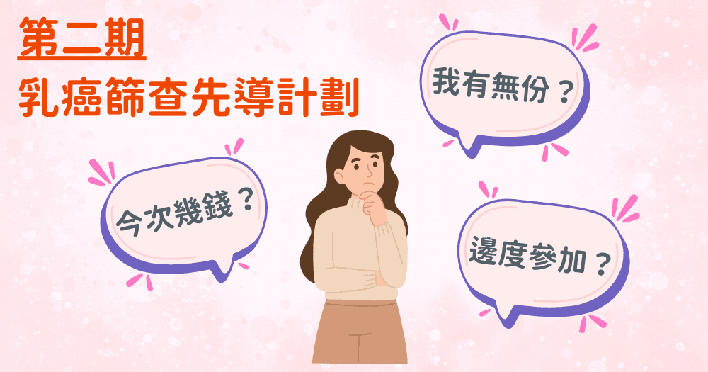 繼2020年底開始的第一期乳癌篩查先導計劃,第二期乳癌篩查先導計劃已於2025年展開。第二期在第一期乳癌篩查先導計劃基礎上擴大覆蓋範圍。35歲至 74歲的婦女,只要乎合以下資格,即可報名接受評估,詳情請瀏覽:https://www.breastscreen.gov.hk/tc/。